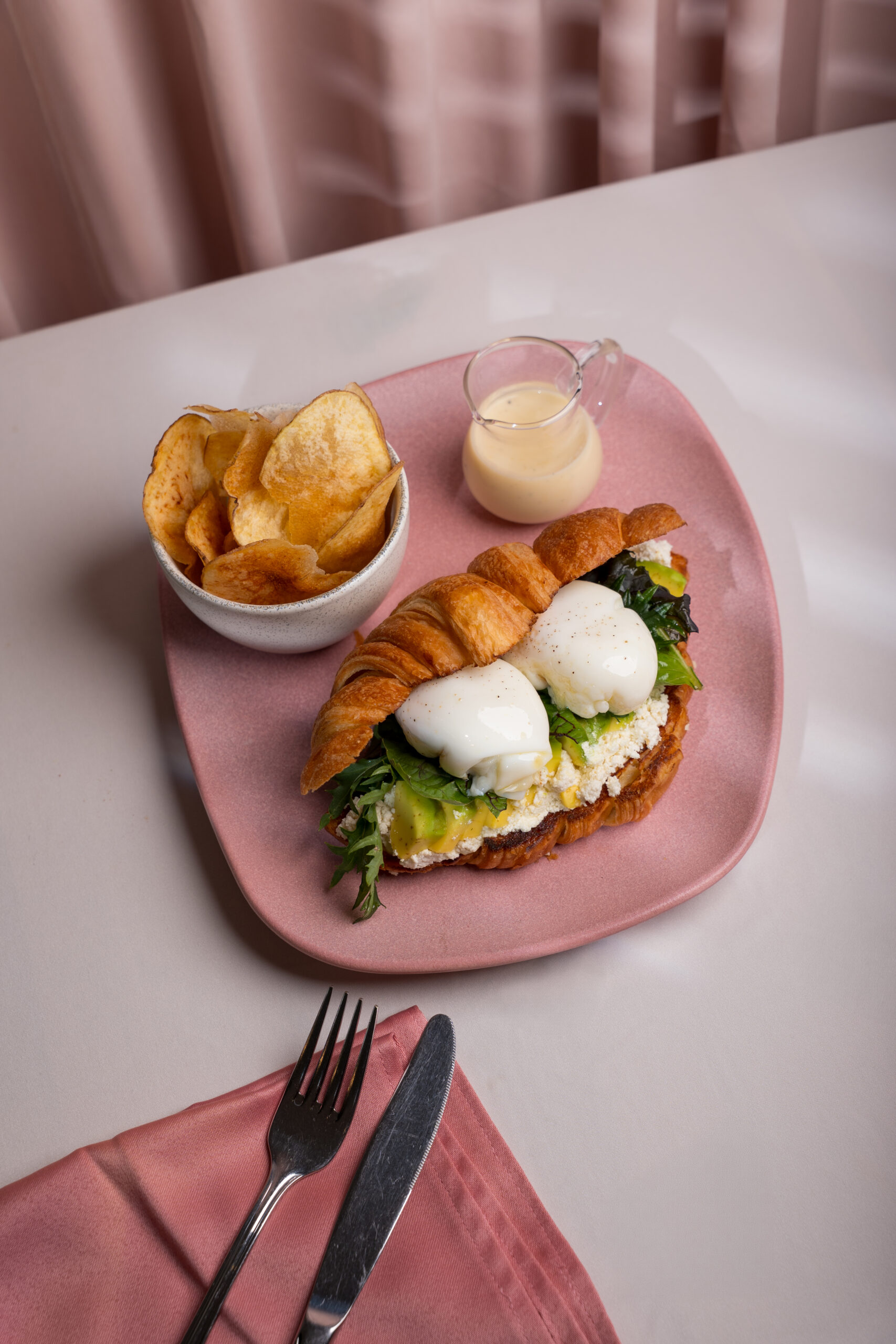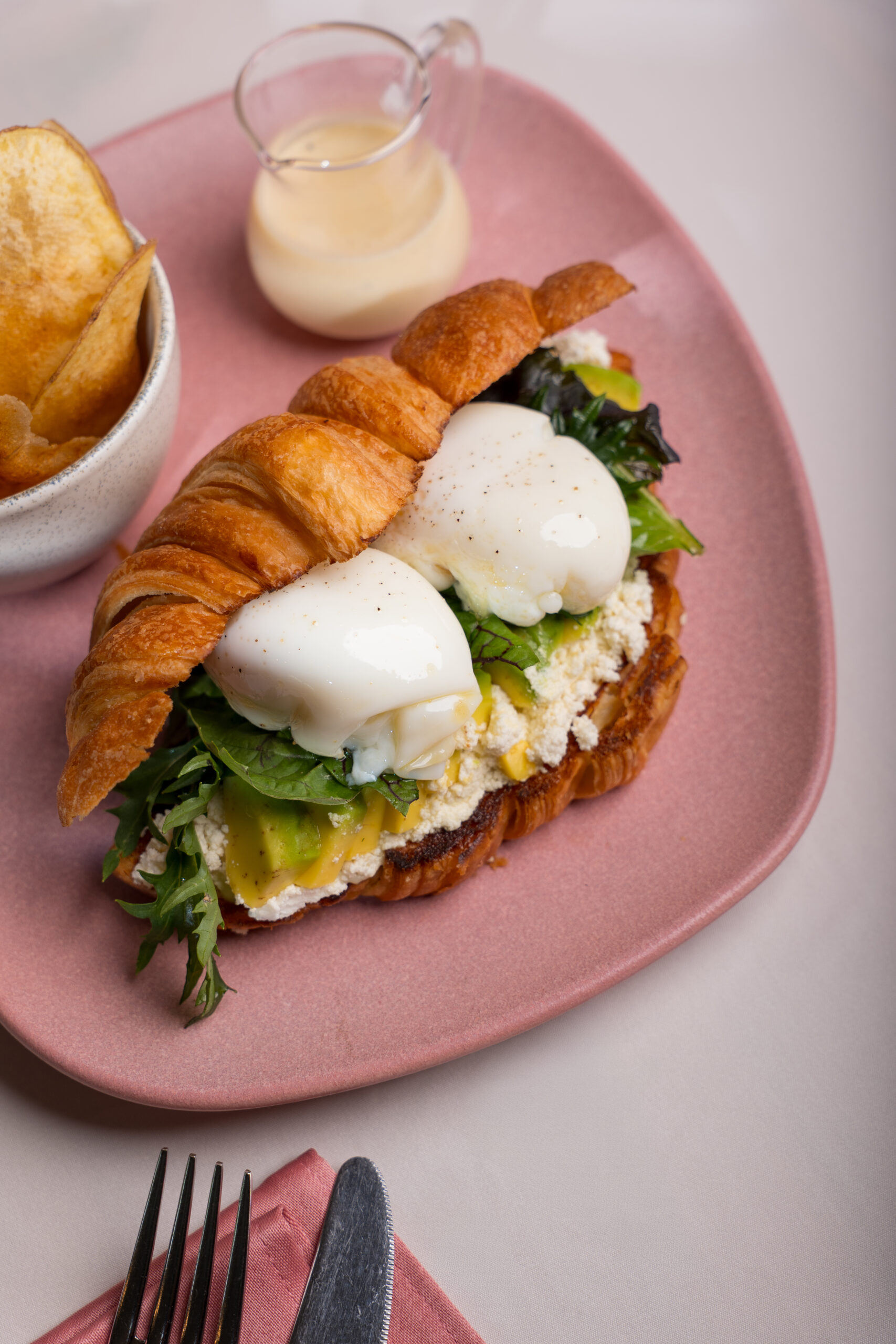 Croissant relleno de queso ricota, aguacate, huevos pochados bañado en salsa de quesos al gusto.