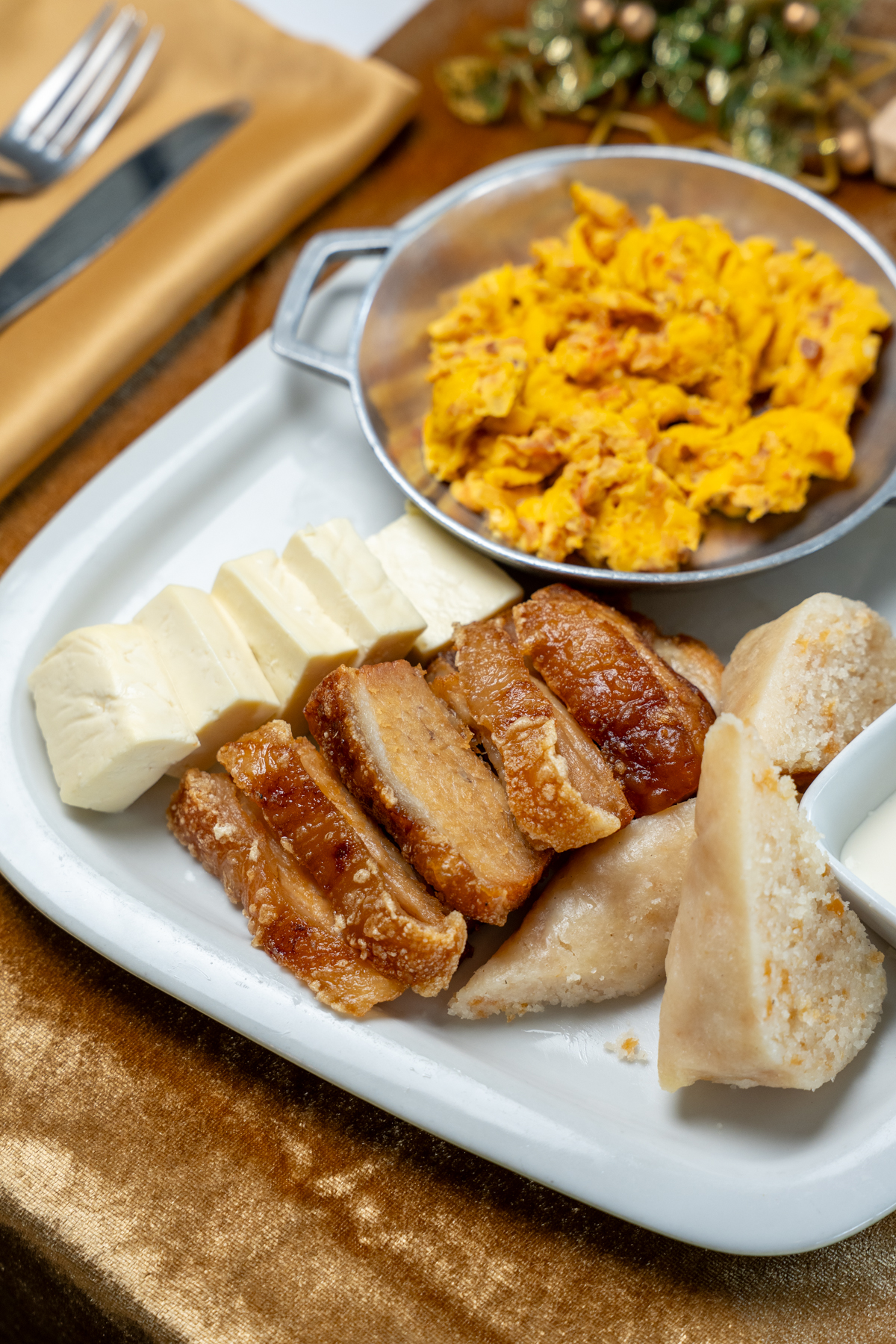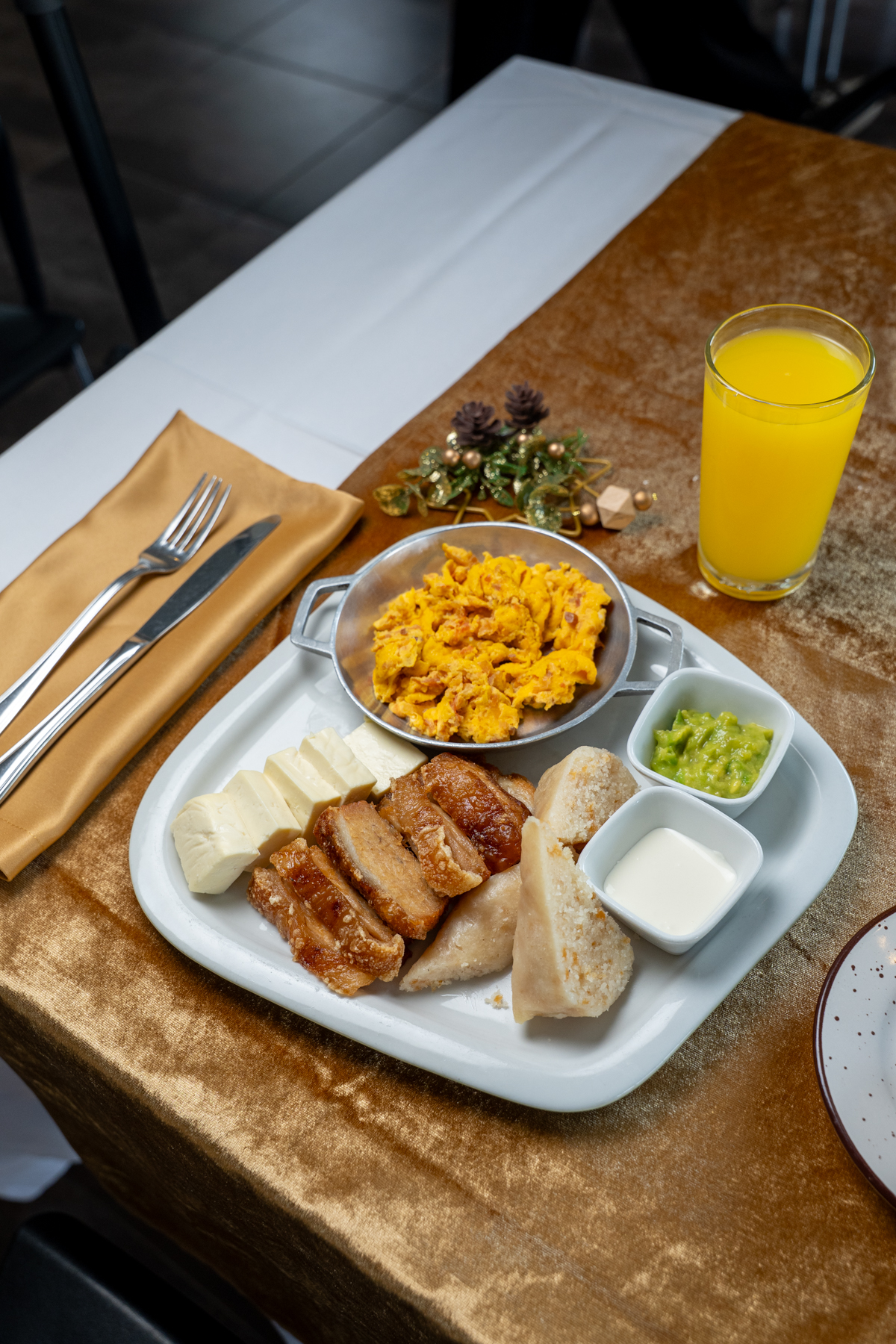 Huevos pericos, chicharrón carnudo, queso campesino y tungo acompañado de puré de aguacate y suero costeño.
