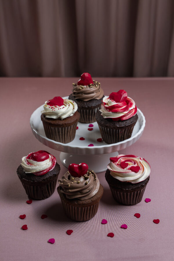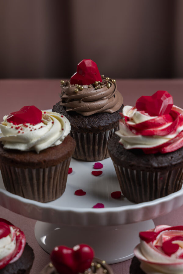 Muffins de chocolate rellenos de ganache de chocolate decorados con crema y mucho amor.